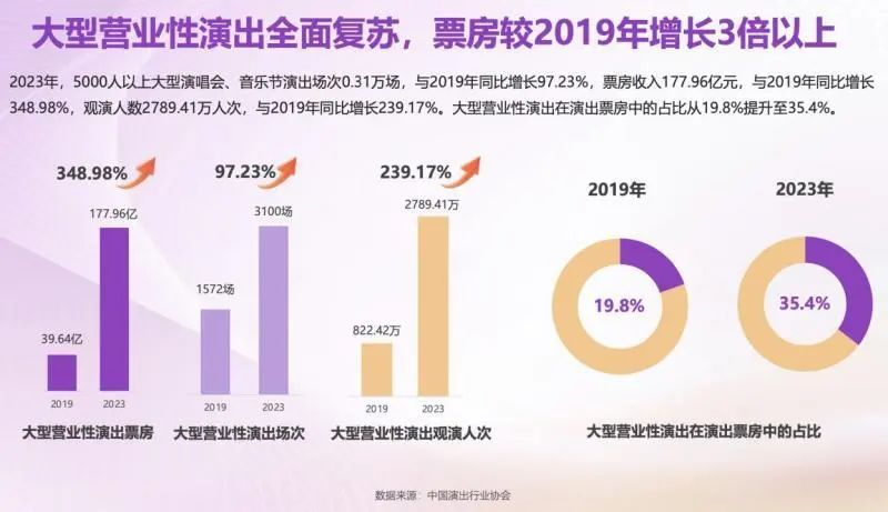 大演报告显示,2023年大型营业性演出全面复苏,演唱会、音乐节爆发式增长,2023年5000人以上大型演唱会、音乐节演出场次达0.31万场,同比2019年增长97.23%,票房收入177.96亿元,较2019年增长348.98%;同时,剧场类演出报告指出,2023年专业剧场演出也全面开花,全年专业剧场演出场次达9.74万场,同比2019年增长31.09%;票房收入86.23亿元,较2019年增长14.21%。