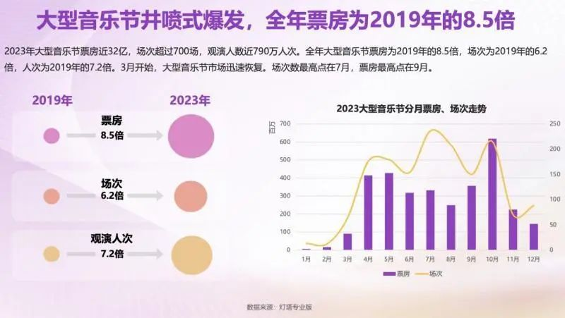 音乐节方面,票房、场次、观演人次亦均呈倍数级增长。2023年大型音乐节票房近32亿,总场次超700场,观演人次近790万。较2019年,2023年大型音乐节票房增长8.5倍,场次增加6.2倍,观看演人提升7.2倍。