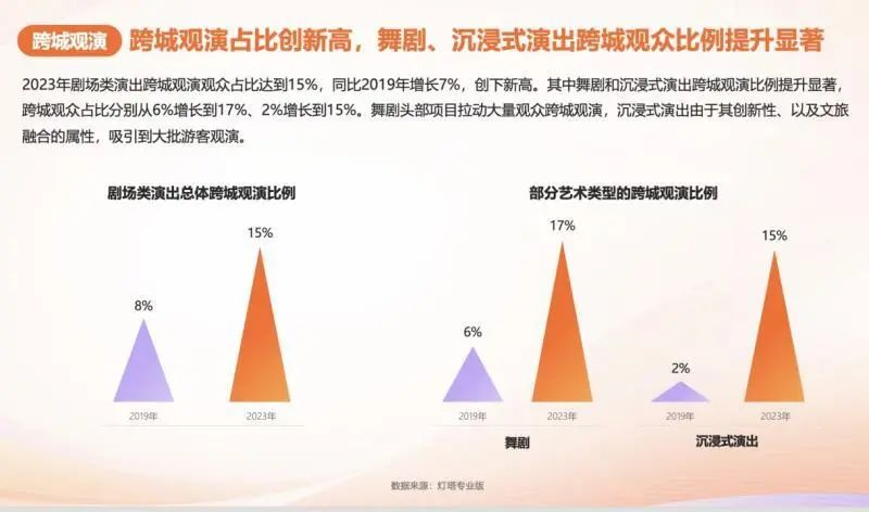 2023年跨城观演为城市文旅发展带来了新的流量密码,大演报告显示,2023年大型演唱会跨城观演比例达68%,同比2019年增长7.4%,创历史新高。与非跨城观众相比,跨城观众也倾向于在观看演出后在当地及周边城市进行旅游,占比达到26.8%。这表明跨城观众更愿意为高品质演出付费,追求更极致的文旅消费体验。