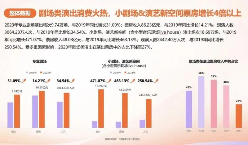 从票房规模上看,剧场类演出报告显示,2023年专业剧场票房收入86.23亿元,同比2019年增长了14.21%。其中,小剧场、演艺新空间(含小型音乐现场Live house)票房收入48.03亿元,同比2019年增长463.13%。