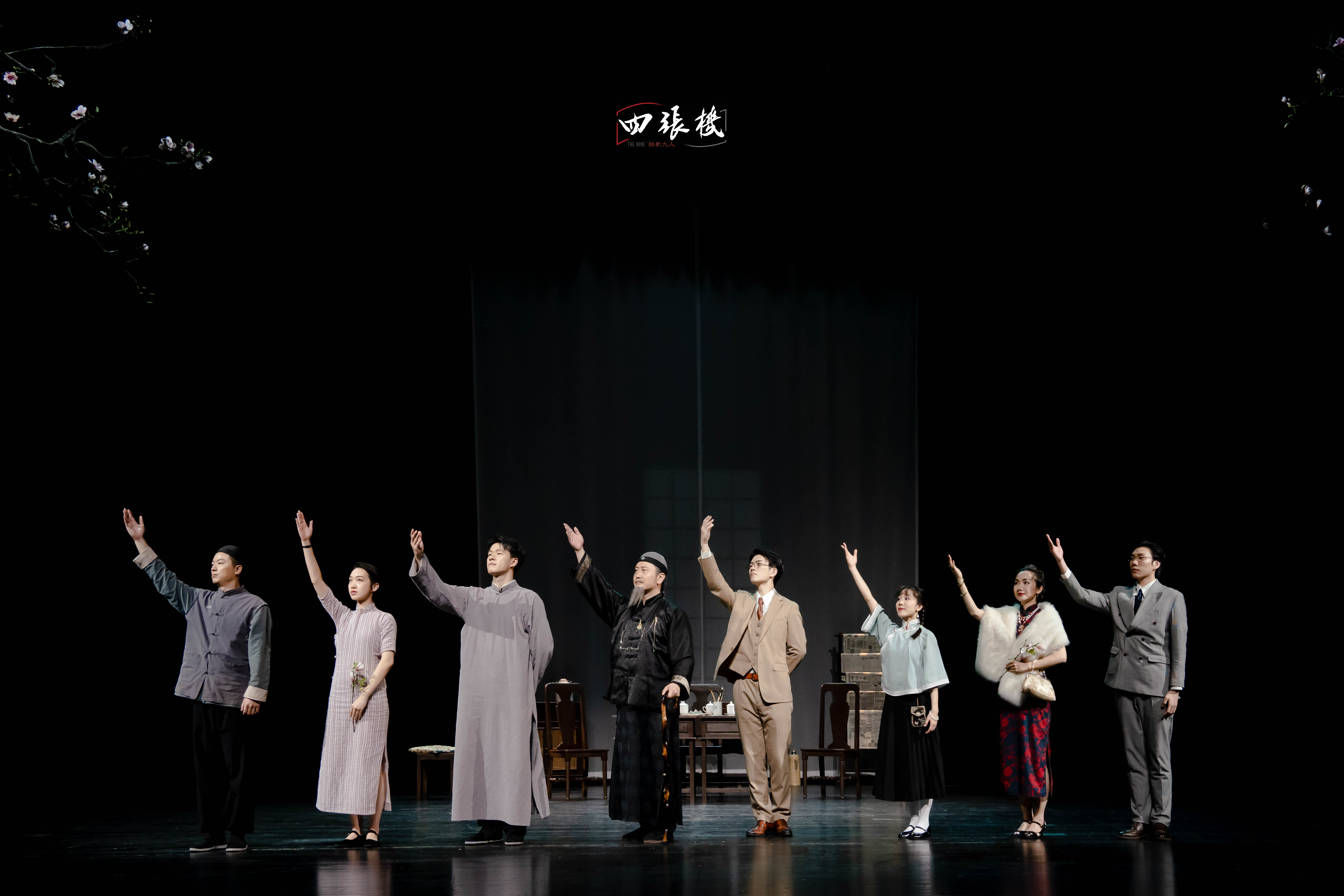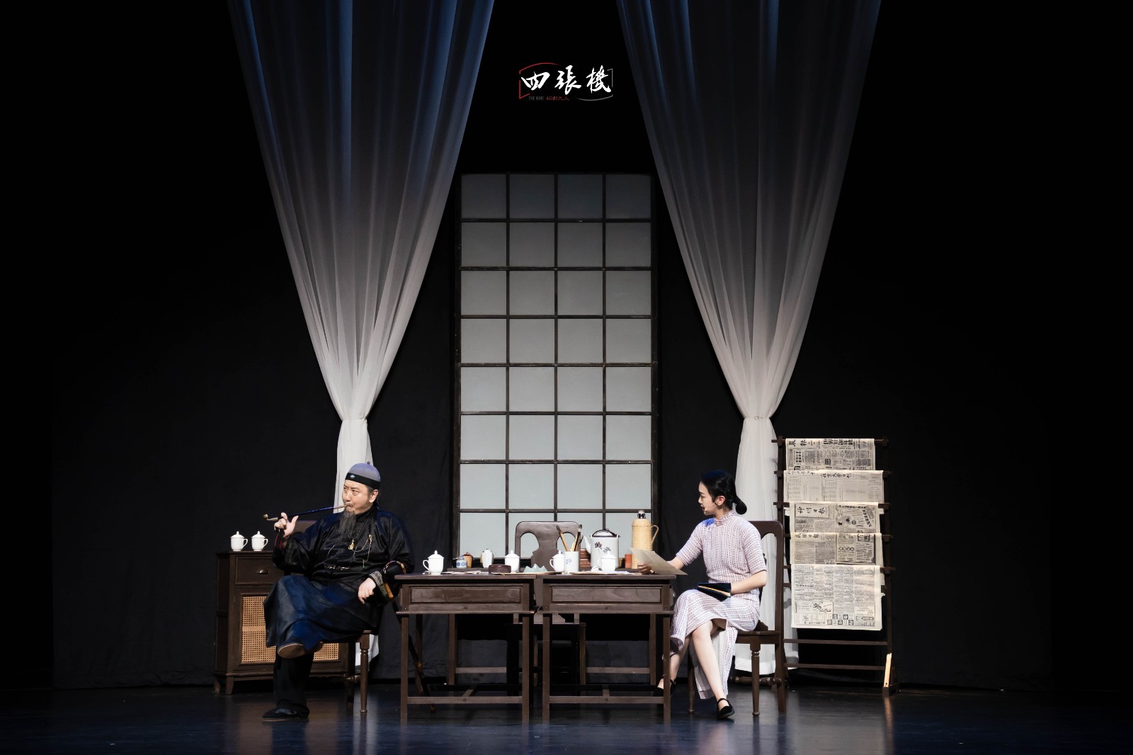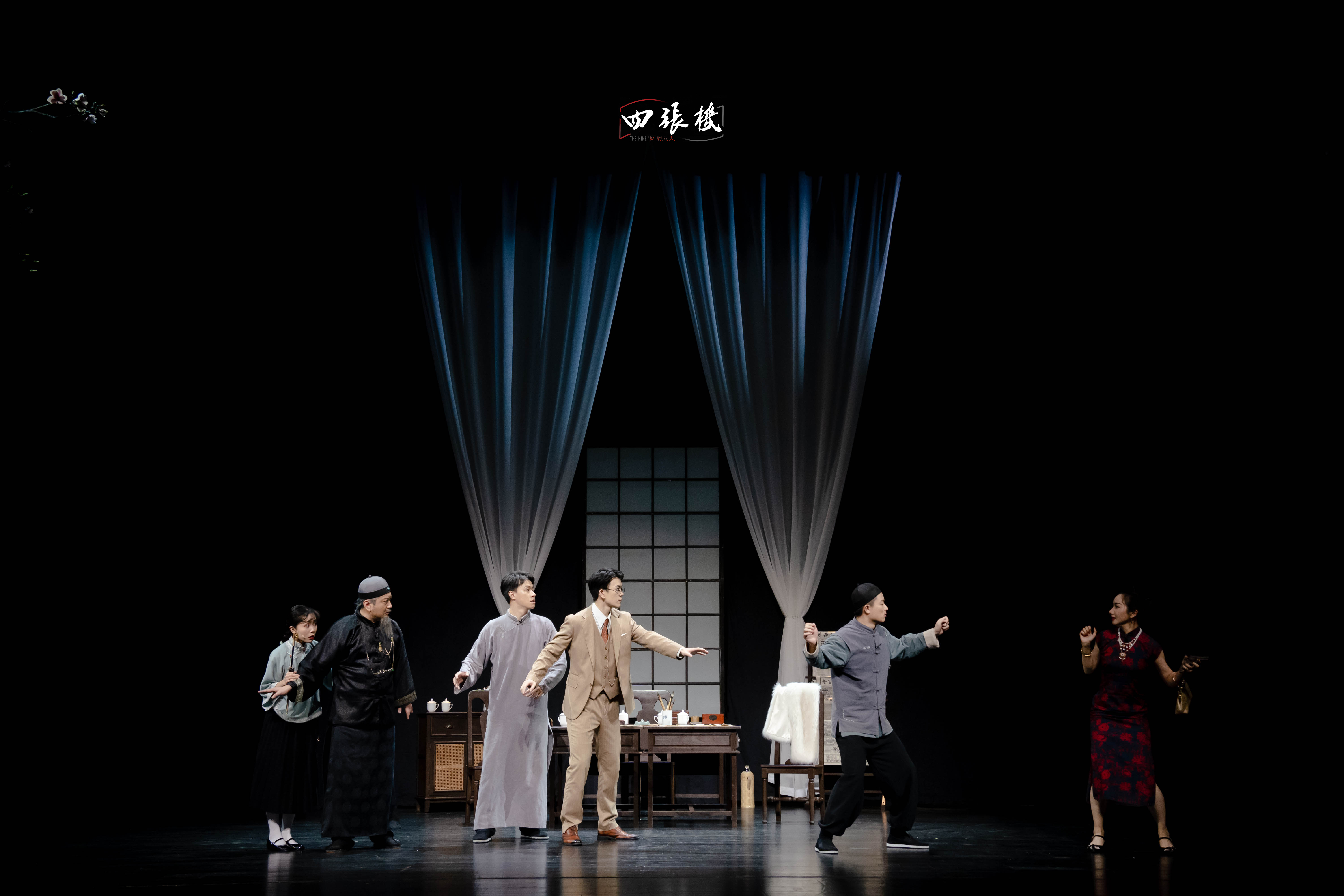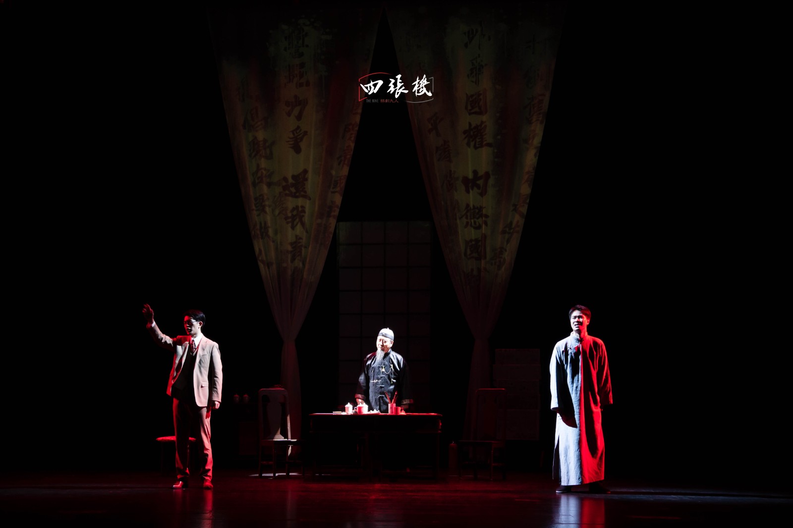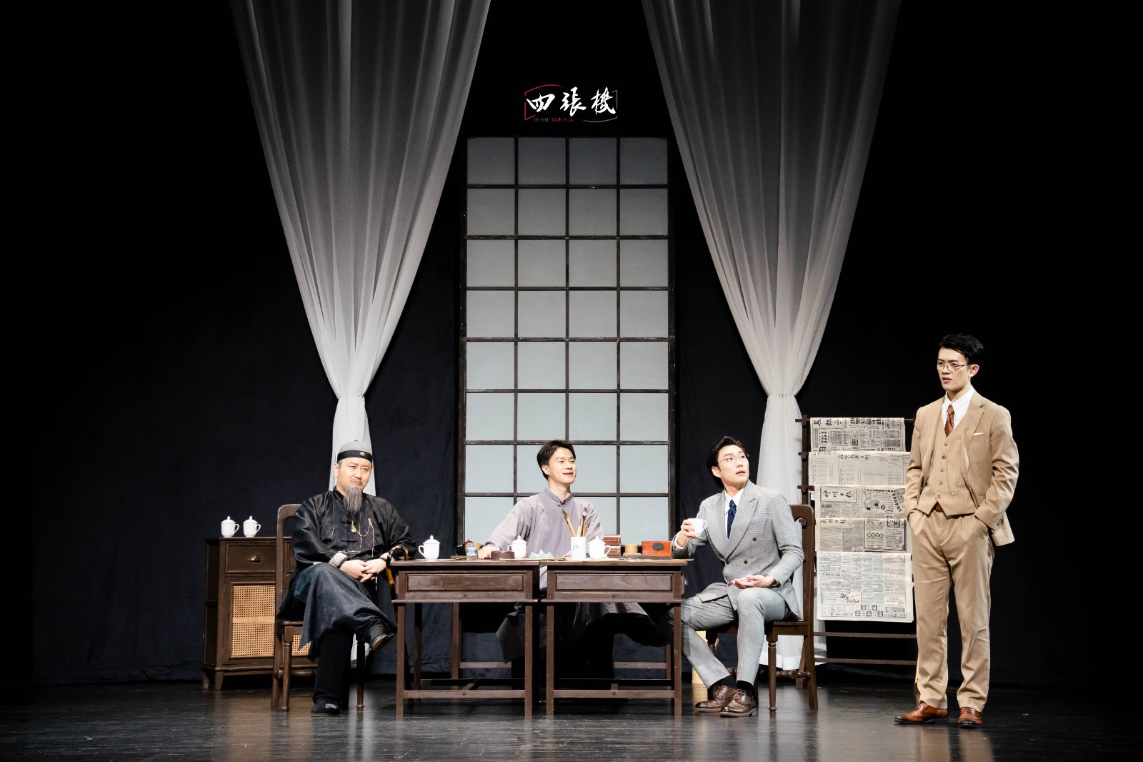 《四张机》初版剧本于2021年末公开,三位教授作为“铁三角”撑起一台戏:古鹤箴不仅是学界泰斗,更是论战中难缠的对手;卢泊安年少成名、狂飙突进,却总在恋爱问题上乱了阵脚;求三野敦厚温良,一个常被卢斥作“也行也好也同意”的和平主义者,也有坚守至最后一刻的底线价值。2023年春,打磨升级后的新版《四张机》于北京首演。除了剧本的调整外,还在舞美、灯光、道具、服装等方面进行了全方位升级,给观众带来更深的观演沉浸感和更精致的舞美体验。