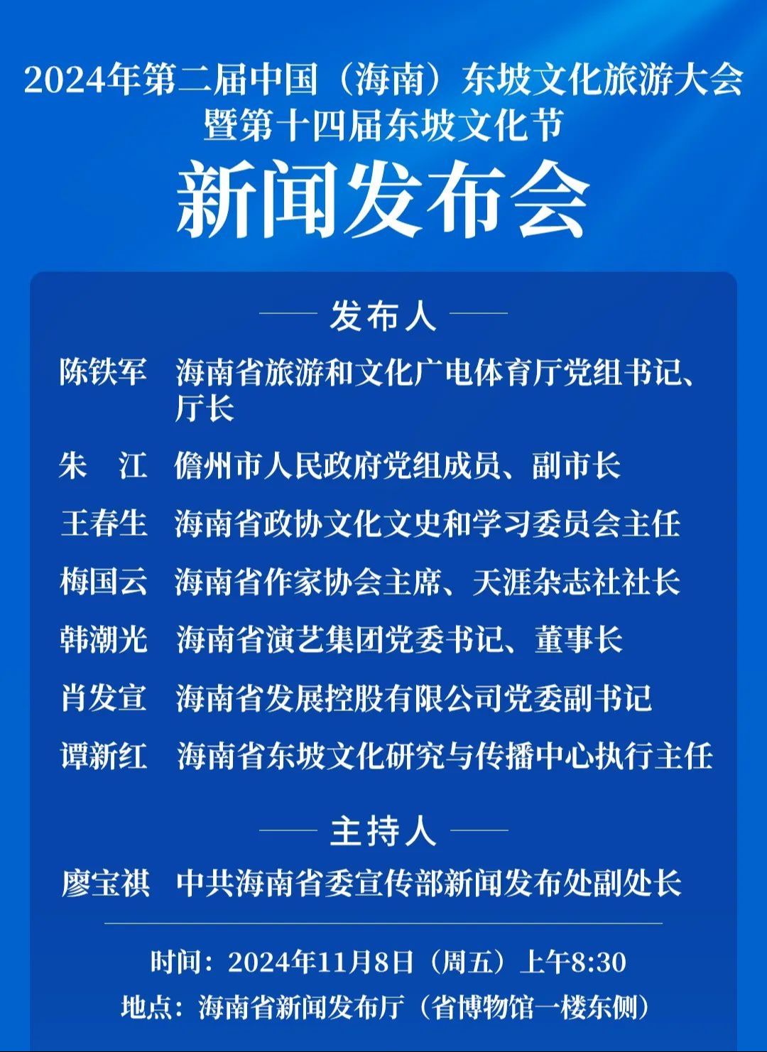 海南省新闻办公室将于2024年11月8日(星期五)上午8:30在海南省新闻发布厅(省博物馆一楼东侧)举行2024年第二届中国(海南)东坡文化旅游大会暨第十四届东坡文化节新闻发布会,邀请海南省旅游和文化广电体育厅党组书记、厅长陈铁军,儋州市人民政府党组成员、副市长朱江,海南省政协文化文史和学习委员会主任王春生,海南省作家协会主席、天涯杂志社社长梅国云,海南省演艺集团党委书记、董事长韩潮光,海南省发展控股有限公司党委副书记肖发宣,海南省东坡文化研究与传播中心执行主任谭新红介绍相关情况,并答记者问。