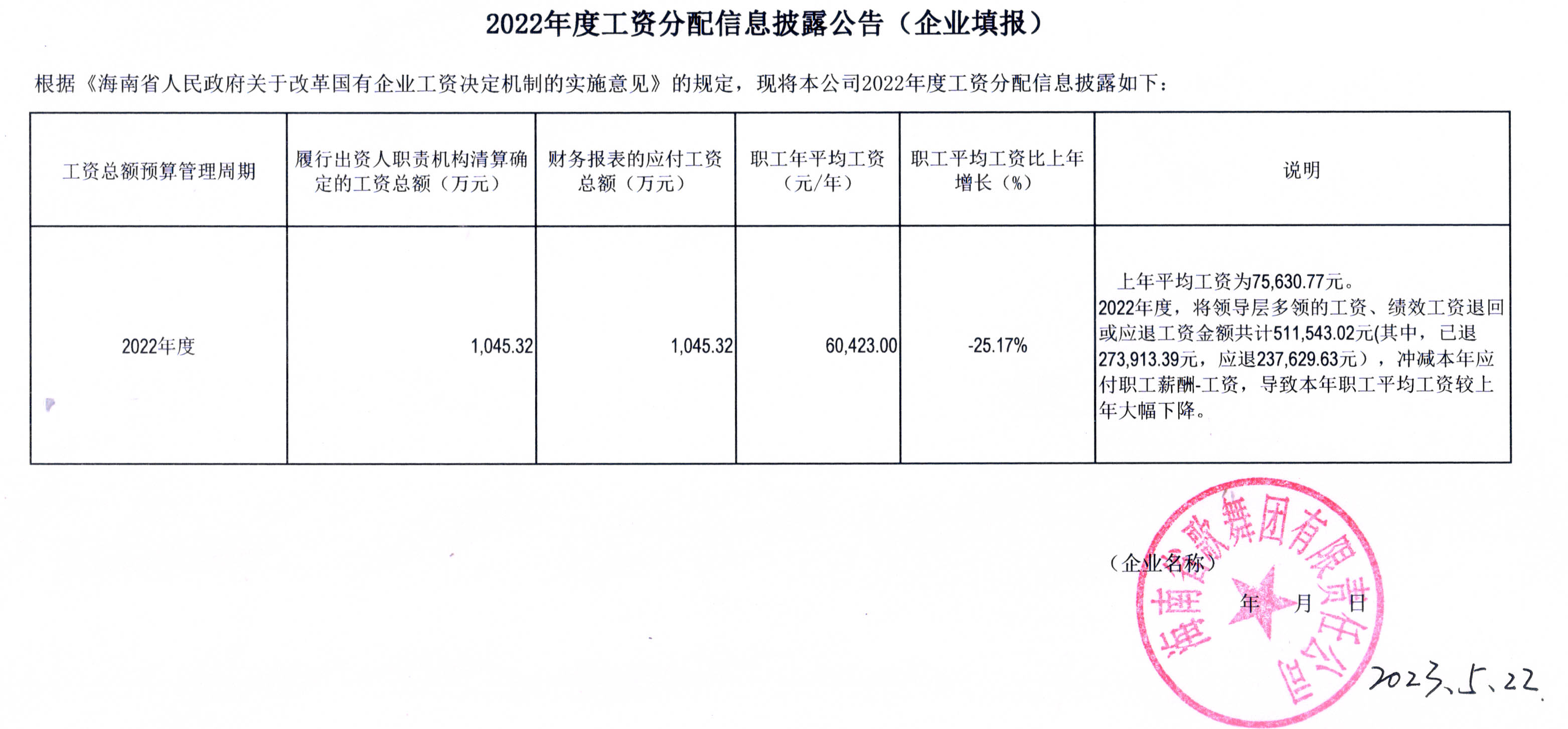 2022年度海南省歌舞团有限责任公司履行出资人职责机构清算确定的工资总额为1045.32万元,财务报表应付工资总额为1045.32万元,职工年平均工资为60423元/年,职工平均工资比上年下降25.17%。
