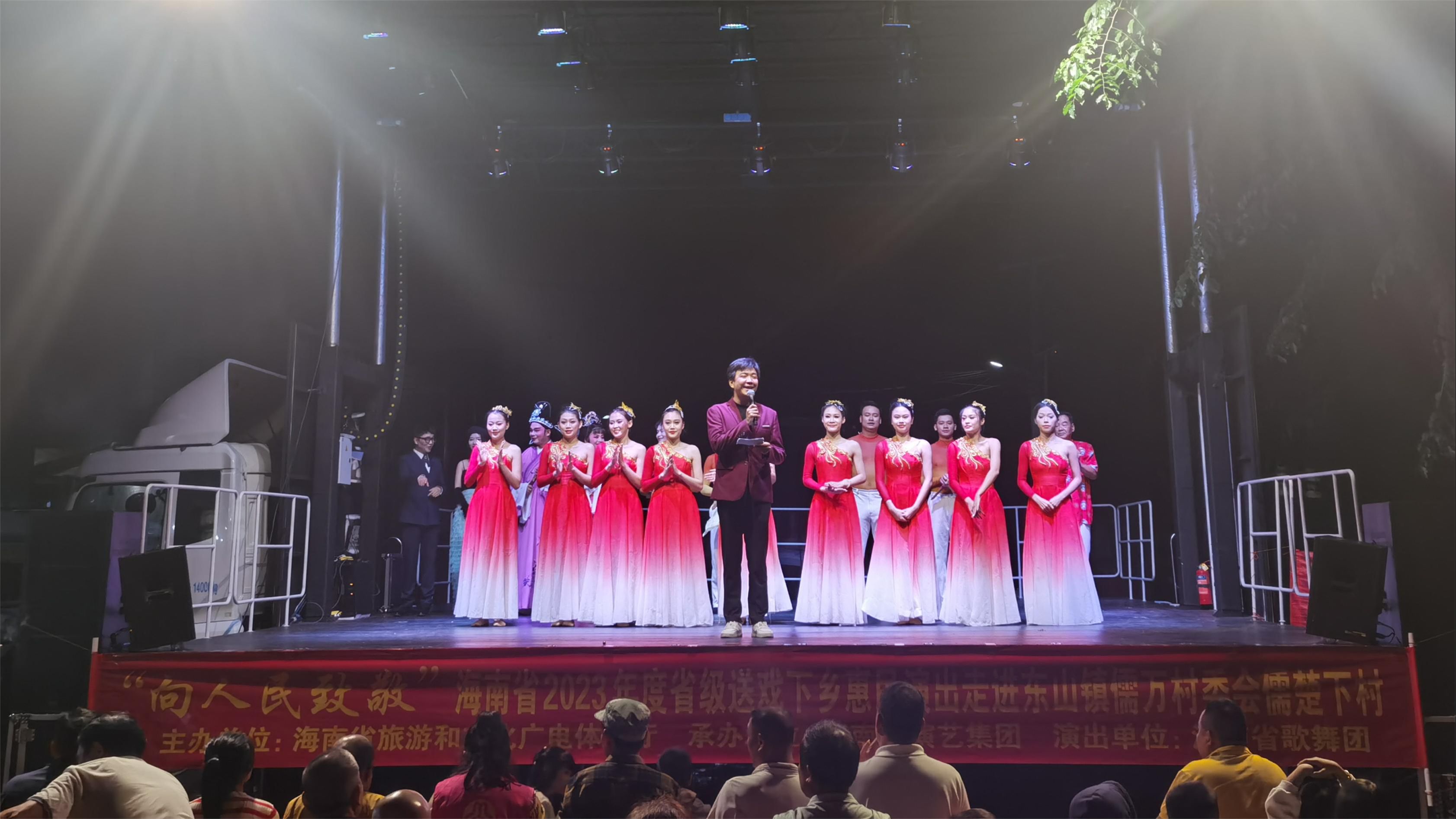 11月13日晚,由海南省演艺集团旗下省歌舞团精心编排的“向人民致敬”海南省2023年度省级文化送戏下乡惠民演出走进革命老区村庄海口东山镇儒万村委会儒楚下村,通过音乐、舞蹈、戏剧等表演形式,为老区民众送上了一场丰盛的文化大餐。