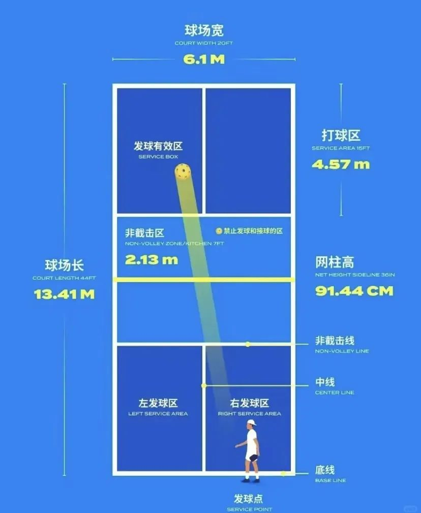 而匹克球场地大小为44英尺X20英尺,除了划线以外,其他与一个正常的双打羽毛球场并无不同。