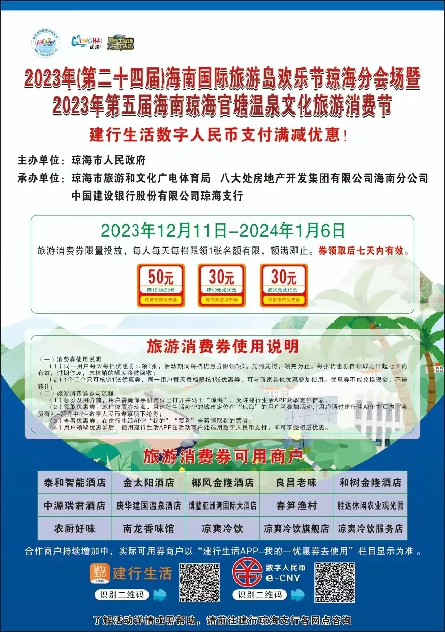 “艺起游琼海 欢乐泡温泉”。2023年(第二十四届)海南国际旅游岛欢乐节琼海分会场暨第五届海南琼海官塘温泉文化旅游消费节已于12月2日晚启幕。