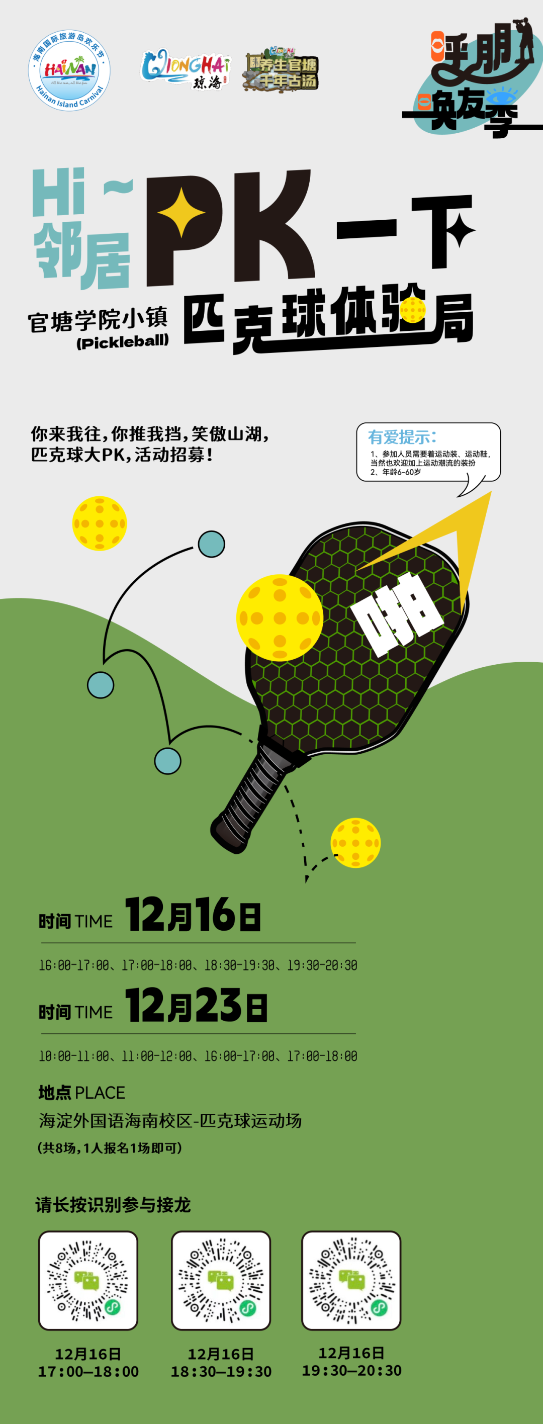 12月16日,第五届海南琼海官塘温泉文化旅游消费节系列活动——匹克球训练体验活动即将开始。